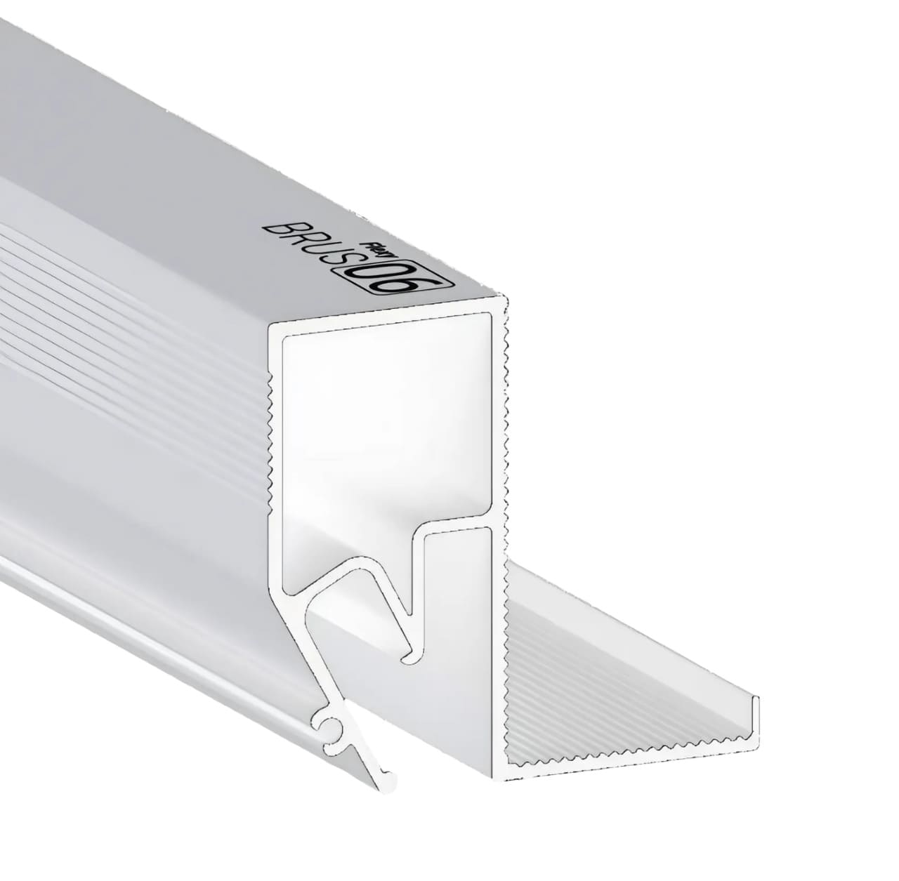 Строение профиля в своём основании имеет литую декоративную планку, которая закрывает сердечник материала стен лестничного колодца с толщиной до 20 мм. Если толщина стенки менее 20 мм, полость, образованная между BRUS 06 и стеной, заполняется пенным составом с низким коэффициентом расширения для достижения максимальной стабильности соединения.