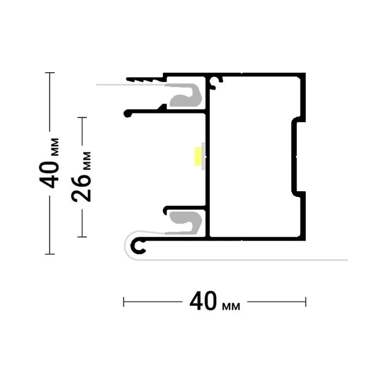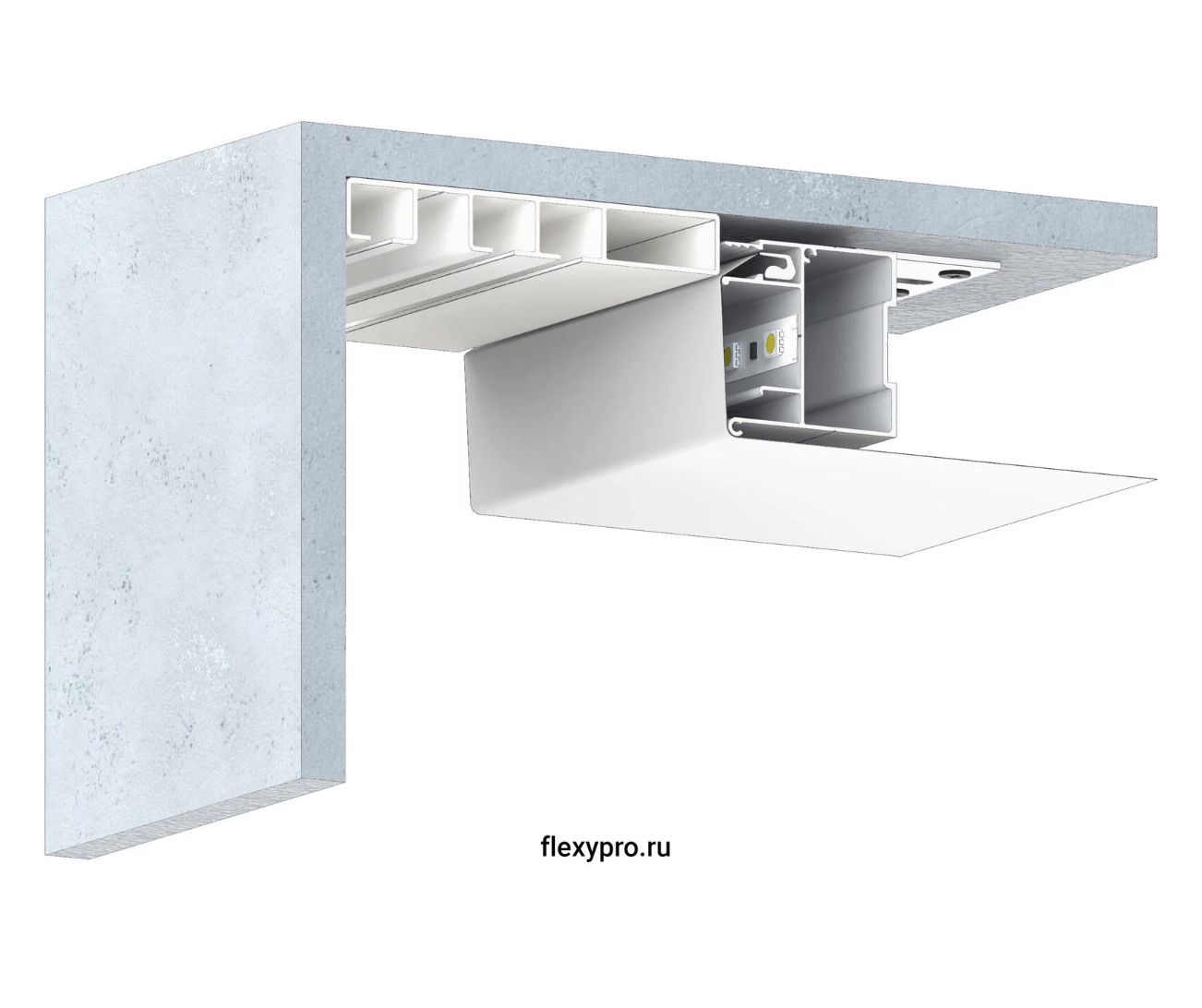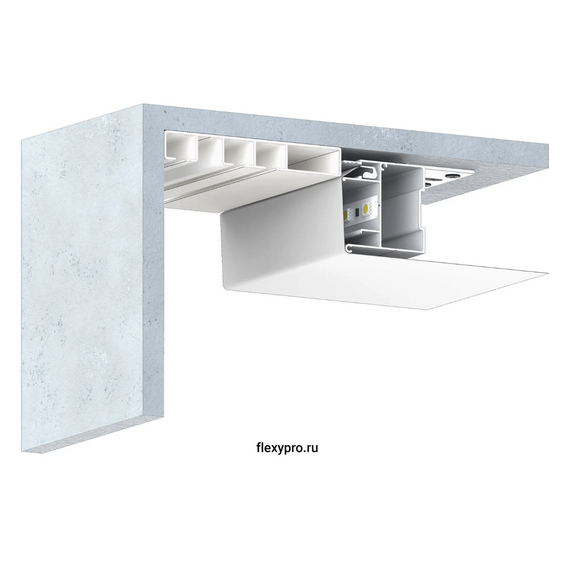 Профиль Flexy BRUS 01 для натяжных потолков с гарпунной системой крепления полотна. Для изготовления конструкций, ниш, обхода сложных стен. C полкой для светодиодной ленты.