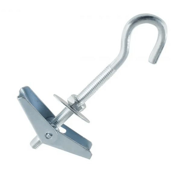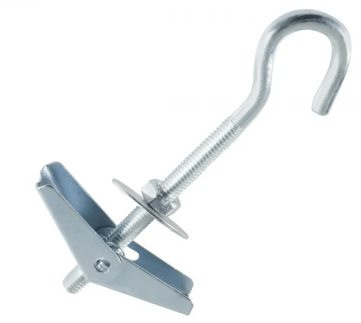 Крюк с метрической резьбой, со стальными стопорными крыльями, в комплекте с гайкой шестигранной и шайбой. Сфера применения: Дюбель предназначен для крепления светильников, люстр, кабельных каналов к гипсокартонным плитам, ДСП и к другим пустотелым строительным материалам.
