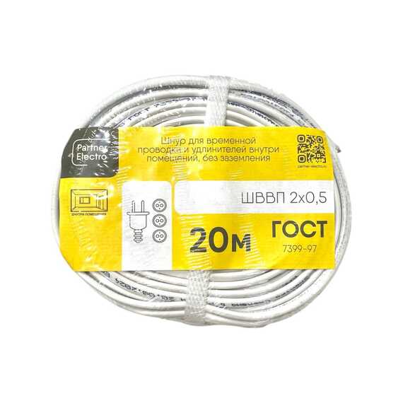 Шнур ШВВП 2х0,5 ГОСТ (20м) – шнур гибкий с параллельными медными жилами с изоляцией и оболочкой из ПВХ-пластиката на напряжение до 380 В для систем 380/380 В. Шнур ШВВП применяется для присоединения приборов личной гигиены и микроклимата, электропаяльников, светильников, кухонных электромеханических приборов, радиоэлектронной аппаратуры, стиральных машин, холодильников и других подобных приборов, эксплуатируемых в жилых и административных помещениях. Страна производства — Россия.