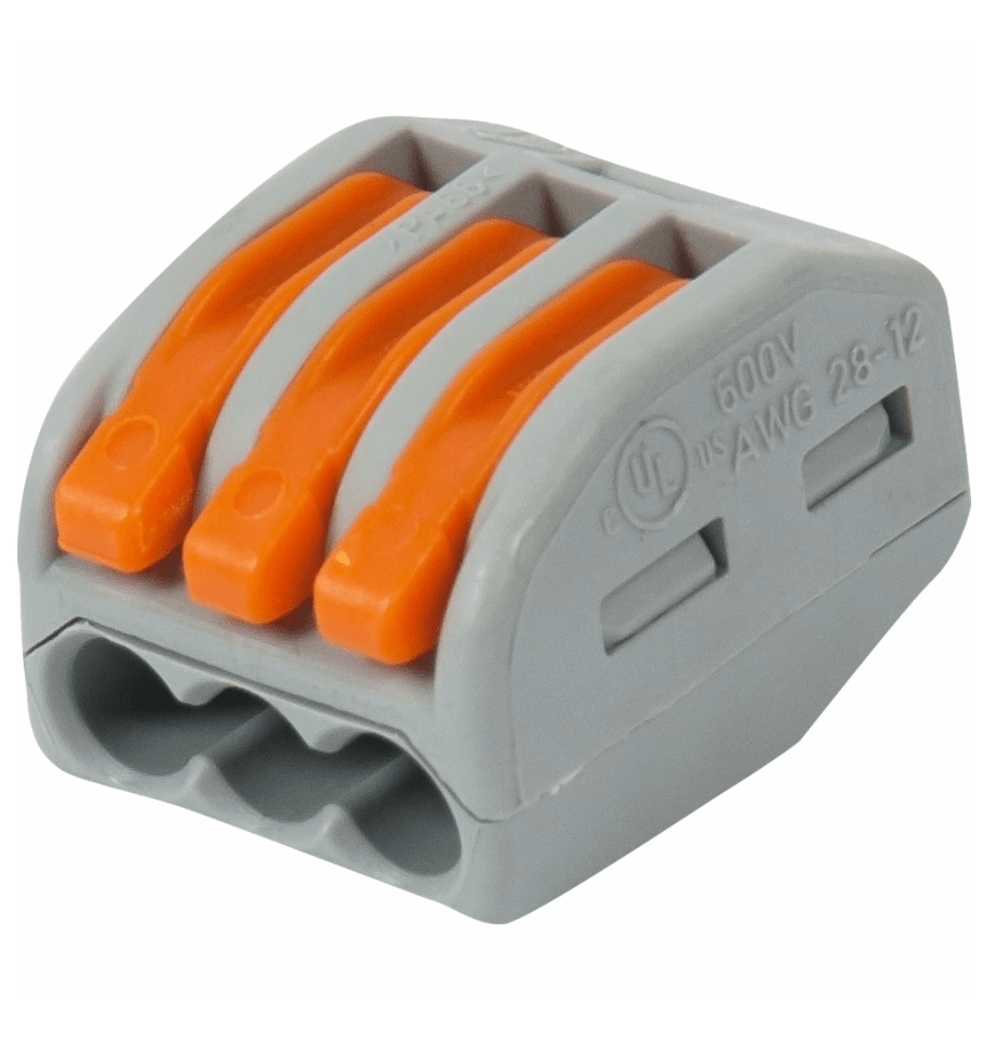 Клеммная колодка 3-х контактная с нажимным рычагом для медных одножильных и многожильных проводников сечением 0,08 – 4мм2. Рабочее напряжение 380 В, ток 32 А. Для проводников из алюминия данные клеммы заполняются токопроводящей пастой Alu-Plus.