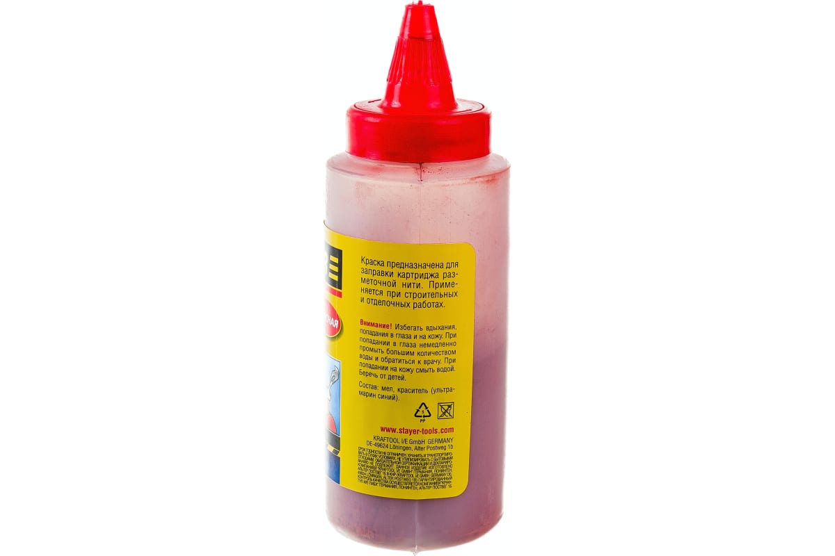 Широкое применение в ремонтных, отделочных, строительных работах находит разметочный шнур. С его помощью очень просто и легко «отбить» идеально ровную горизонтальную, диагональную, вертикальную линию. Достаточно натянуть шнур между двумя ранее поставленными отметками, слегка отвести и отпустить. В месте его соприкосновения с поверхностью останется ярко выраженный след (линия). Однако при условии интенсивного применения, красящая способность инструмента постепенно утрачивается. Получаемая разметка теряет былую четкость, становится блеклой и слабозаметной. В этом случае необходимо заправить разметочную нить, используя меловой порошок (115 г) красный STAYER .Он представляет собой специальный красящий состав, изготовленный на меловой основе.