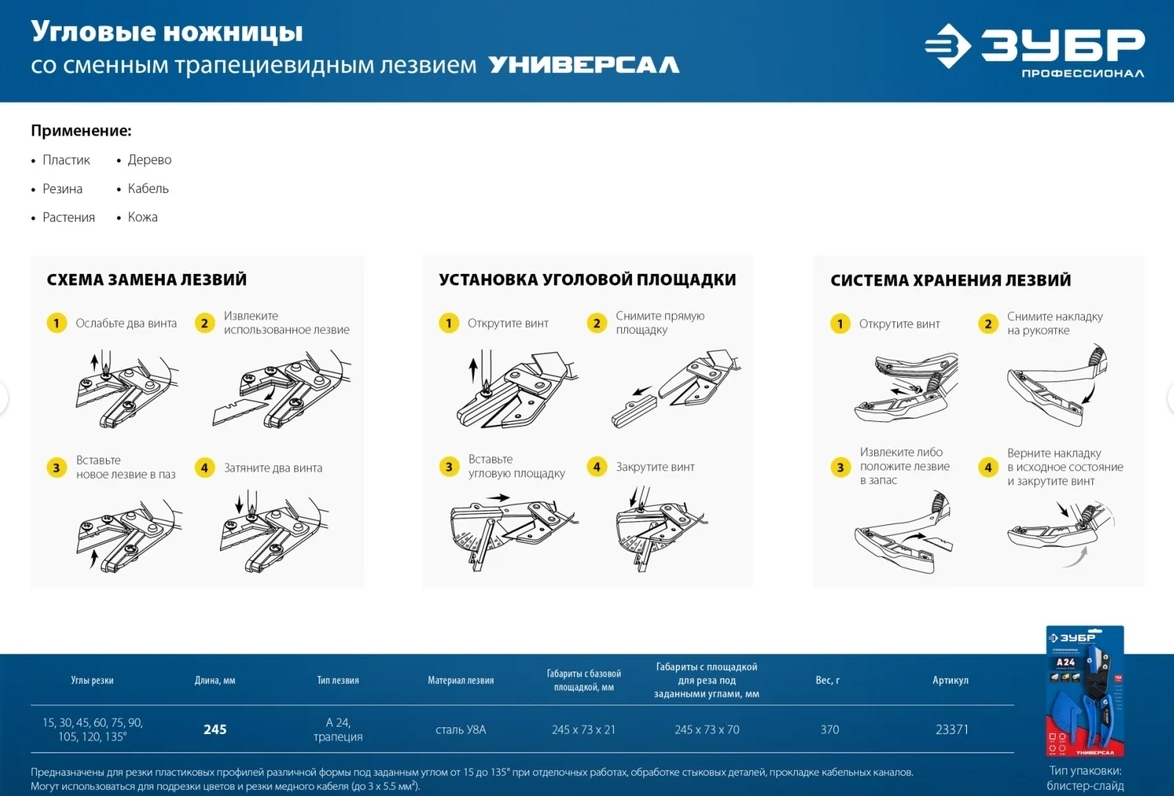 Угловые ножницы ЗУБР Универсал представляет собой универсальный инструмент для чистого реза со сменным лезвием. Идеально справляется с резкой различных профилей из резины и пластика. Ножницы способны резать даже медный кабель сечением до 3х5,5 мм². Сменная площадка для резки под различными углами в комплекте.