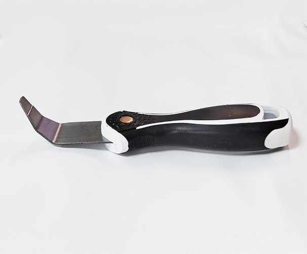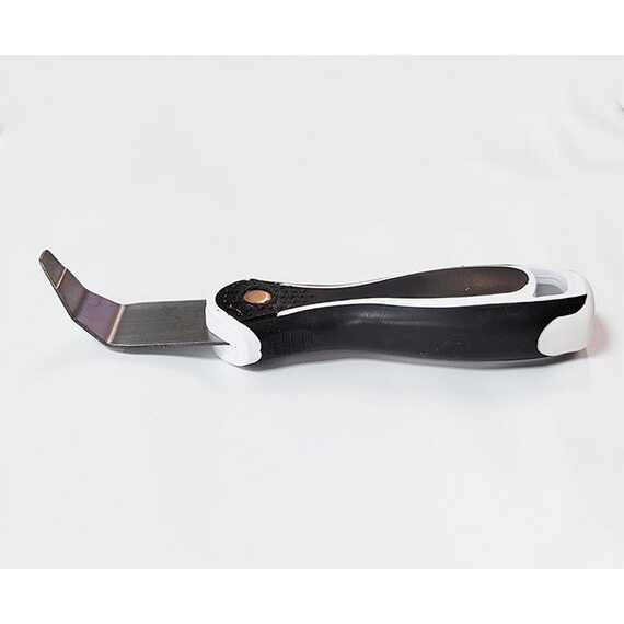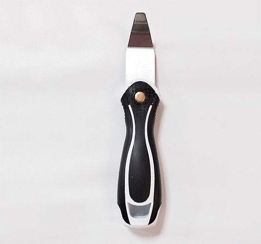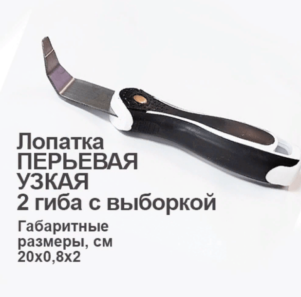 Лопатка имеет изогнутую заострённую форму и ширину "носика" всего 0,8 см, эргономично лежит в руке. Используется в узких труднодоступных местах, например, за газовыми или водопроводными трубами, проходящими близко к стене, применяется для заправки полотна в острых углах ниш и коробов. Изгиб металлической части спроектирован так, чтобы удобно было заправить потолок не повредив обои и потолок.