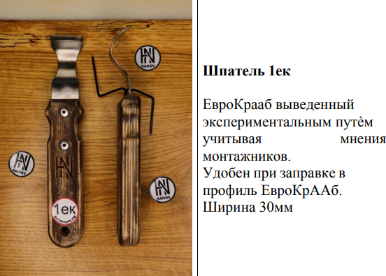 Шпатель №1ЕК «Еврокрааб» экспериментальный (Ханов) — это монтажный шпатель со специальной формой рукоятки и лезвия, разработанный для облегчения установки натяжных потолков. Рабочая поверхность имеет трапециевидную форму, подходящую для профилей системы «Еврокрааб». Экспериментальная форма рукоятки позволяет работать без усталости рук, а уникальная форма лопатки помогает заправлять полотно натяжного потолка в разных местах без повреждения основного потолка или обоев.