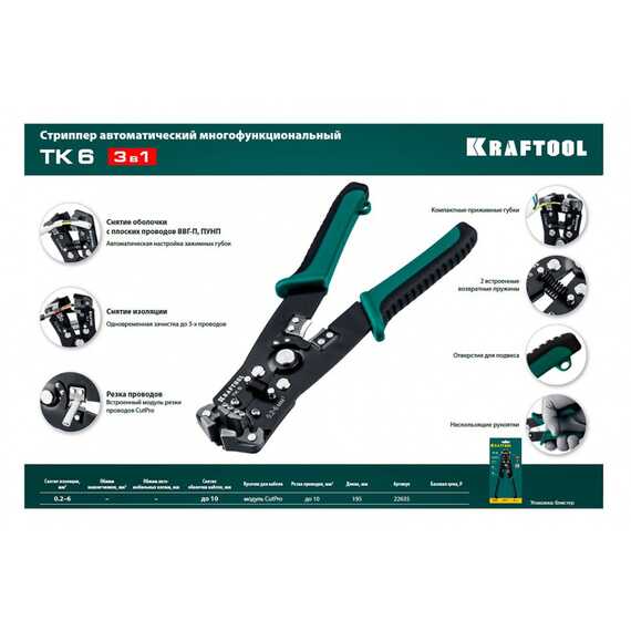 Откройте для себя высокоэффективный автоматический стриппер KRAFTOOL TK-6! Этот многофункциональный инструмент предназначен для точного и аккуратного снятия изоляции с проводов сечением от 0.2 до 6 мм². Оснащенный модулем CutPro для резки кабеля до 10 мм² и микрорегулятором, TK-6 гарантирует идеальный результат без повреждения провода. Двухкомпонентная рукоятка обеспечивает удобство и надежный хват, а петля для подвешивания делает хранение удобным. Прочный, изготовлен из инструментальной стали, этот стриппер станет незаменимым помощником в вашем инструментальном арсенале.