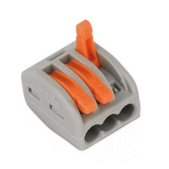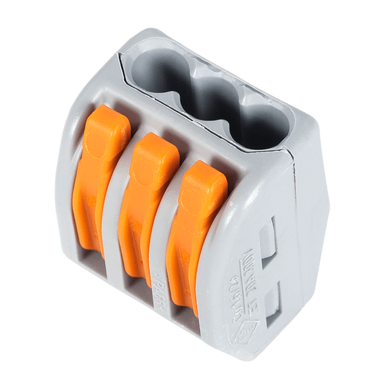 Клеммная колодка 3-х контактная с нажимным рычагом для медных одножильных и многожильных проводников сечением 0,08 – 4мм2. Рабочее напряжение 380 В, ток 32 А. Для проводников из алюминия данные клеммы заполняются токопроводящей пастой Alu-Plus.