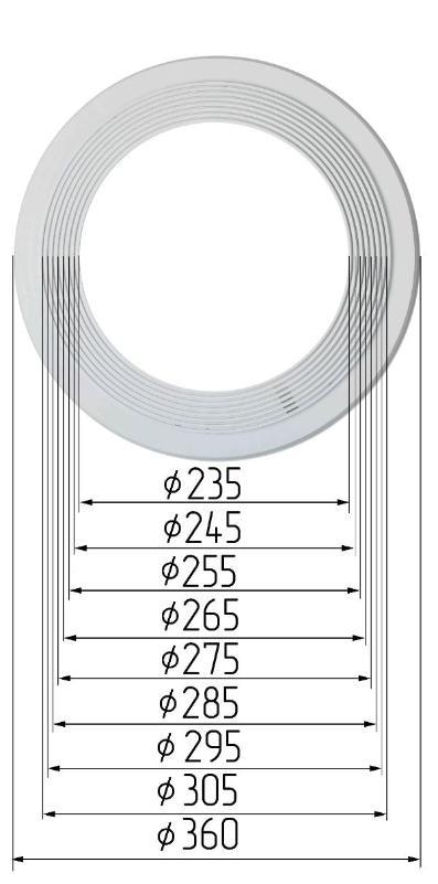 Платформа предназначена для монтажа точечных светильников различных диаметров. Благодаря универсальности конструкции, в данную платформу можно установить светильники с посадочным размером от 235 до 305 мм. Шаг изменения диаметра 10 мм. При подготовке платформы к установке необходимо выбрать нужный диаметр отверстия и с помощью ножа вырезать его по специальной канавке . Для удобства крепления перфоленты ( подвесов ) на платформе имеются специальные площадки с несквозными отверстиями. Наличие ребер жесткости и специального места для крепления перфоленты обеспечивает надежность конструкции и простоту при установке.