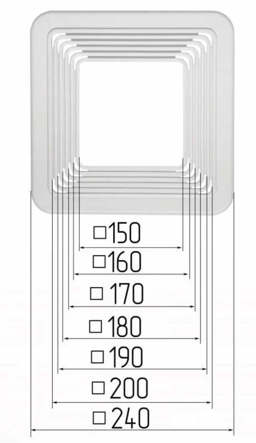 Наружный размер 240х240мм, посадочный размер 150-200мм с шагом в 10мм.
