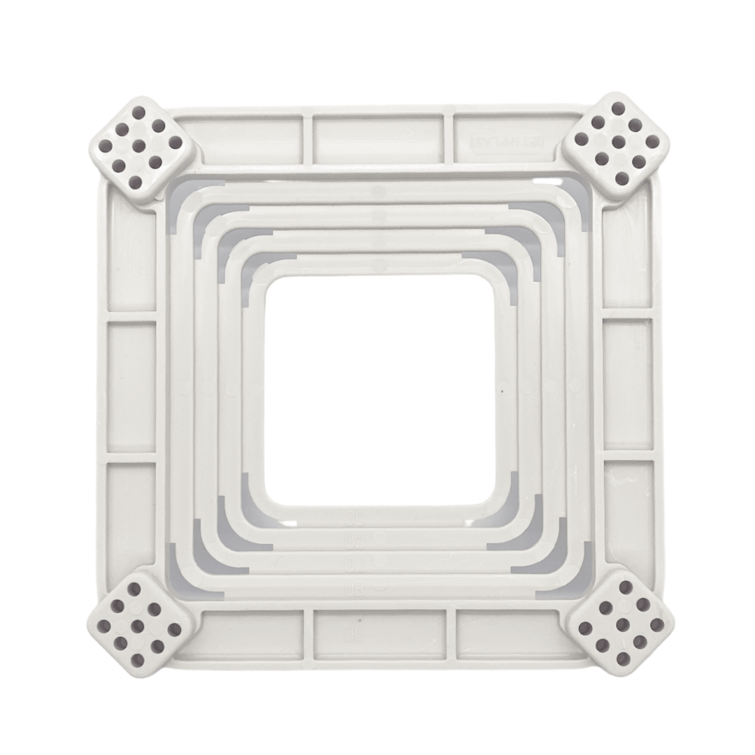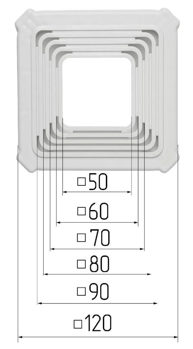 Универсальная платформа представляет собой квадрат ступенчатой формы (форма воронки) с шагом (ступенями) шириной 10 мм. Во время монтажа, выбрав квадрат нужного размера, все квадраты меньшего размера обрезаются. Кроме того, из-за своей ступенчатой структуры площадь контакта платформы с ПВХ пленкой будет минимальной. Благодаря этому, используя даже самое тонкое полотно, универсальная платформа для встроенного светильника не будет видна.