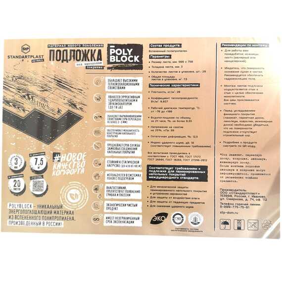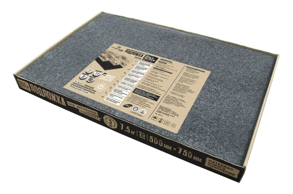 Подложка PolyBlock для ламината и паркета представляет собой листовой материал из вспененного полипропилена, произведенный в России. Получен спеканием под воздействием горячего пара. Обладает высоким уровнем звукопоглощения, малым весом и прочностью, что позволяет использовать ее с большинством видов покрытий (ламинатом, паркет). Подложка не деформируется при нагрузках и укладке, может использоваться для выравнивания черновых полов при перепадах не более 2-3 мм.