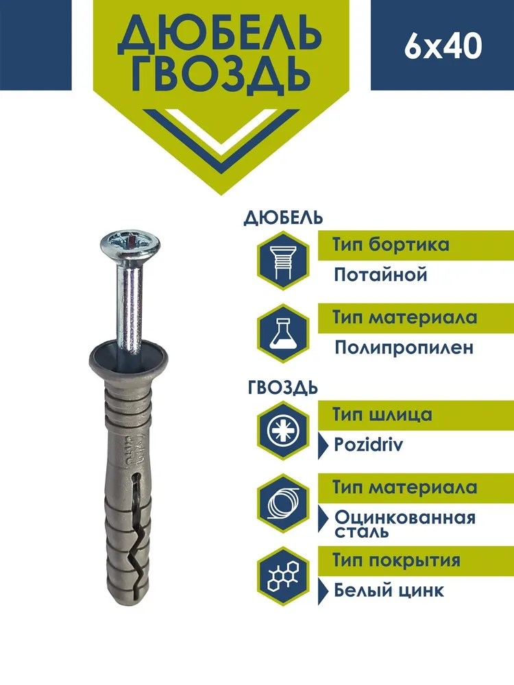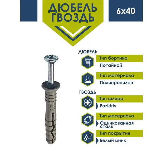 Дюбель-гвоздь Daxmer потай., 6x40, 200 шт. используется для монтажа нетяжелых предметов интерьера, конструкционных элементов и аксессуаров. Применяется в процессе установки оконных и дверных (межкомнатных) блоков, карнизов, кабель-каналов, профиля, легких полок и креплений к основаниям из кирпича, монолита или других полнотелых материалов. Для установки необходимо предварительно просверлить отверстие. Прочность крепежа достигается расклиниванием дюбеля в отверстии гвоздем в момент удара молотком. Гвоздь оснащён винтовой нарезкой и крестообразным шлицем, благодаря чему может осуществляться оперативный демонтаж крепежа. Дюбель-гвоздь с потайным бортиком устанавливается «заподлицо», т.е. его шляпка утапливается, благодаря чему возможно производить крепежные работы без последующего выравнивания поверхности.