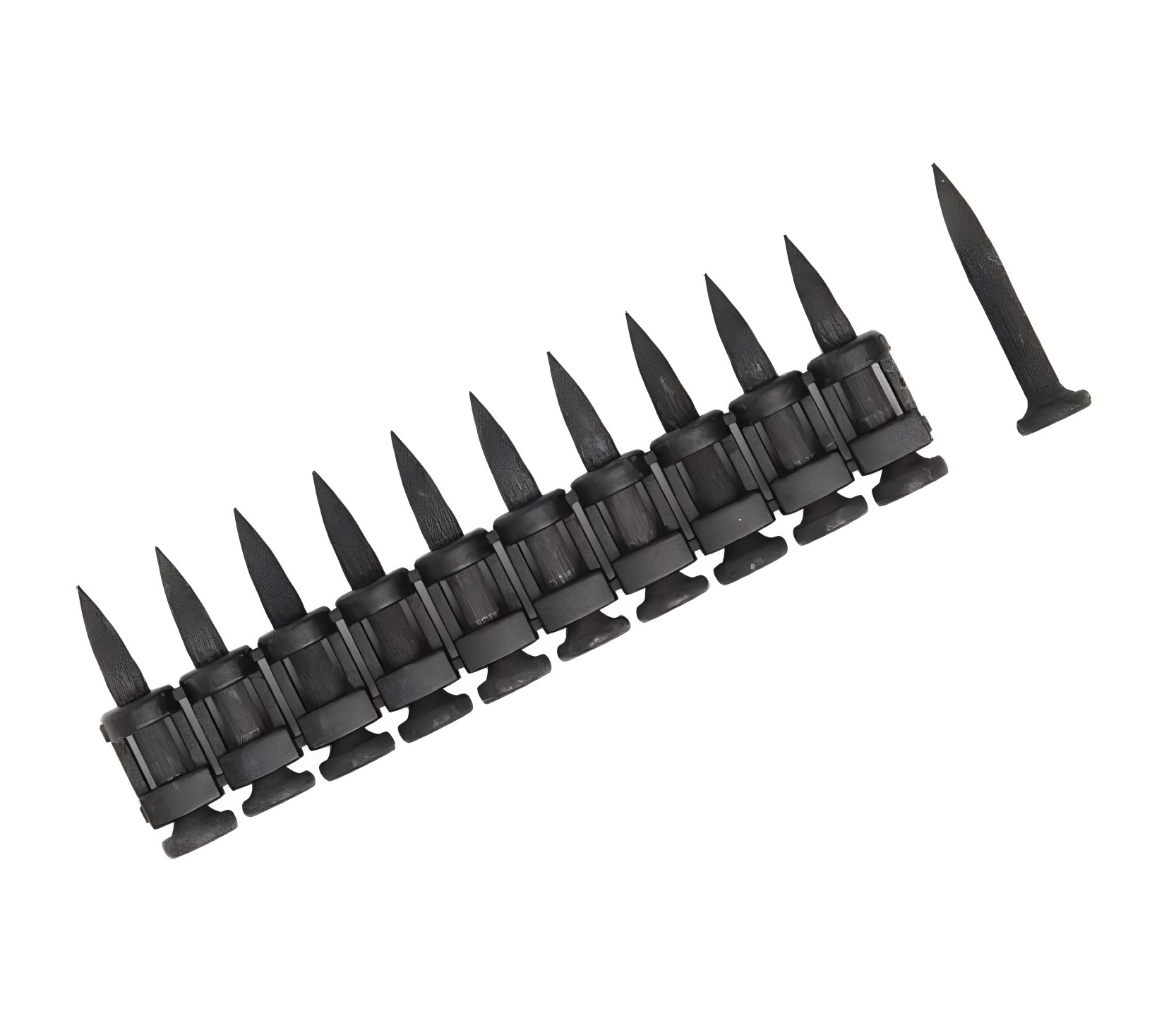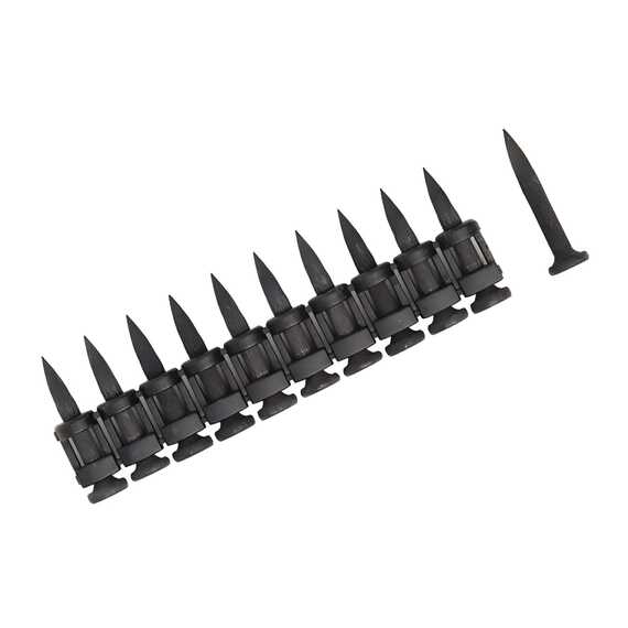 Усиленные гвозди для монтажного пистолета 25х3 мм изготовлены из стали марки СТ-60, обработаны механической гальванизацией. Используются для суперпрочных монолитных конструкций из бетона M350 и металлических швеллеров. Гвозди выполнены в форме пули, с плавным утолщением материала от острия к шляпке гвоздя. Такая форма гвоздя достигается путем прокатки наконечника гвоздя в сдавливающих роликах. Это позволяет уплотнить металл в зоне, где располагается острие.