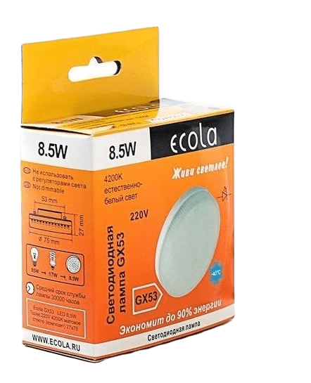 Светодиодные лампы с цоколем GX53 создают комфортный равномерный свет за счет большой площади и матовой поверхности колбы. Лампы GX53 используются совместно с точечным светильником для подвесных и натяжных потолков. Небольшие габаритные размеры и мощный световой поток являются главным преимуществом этих ламп. Световая эффективность 90Лм/Вт.