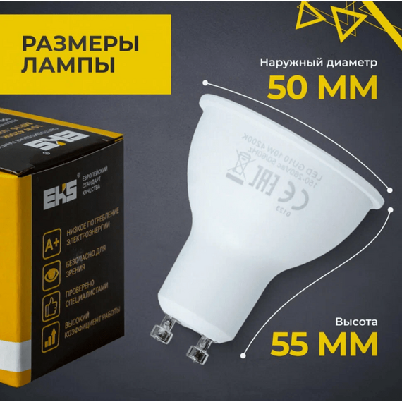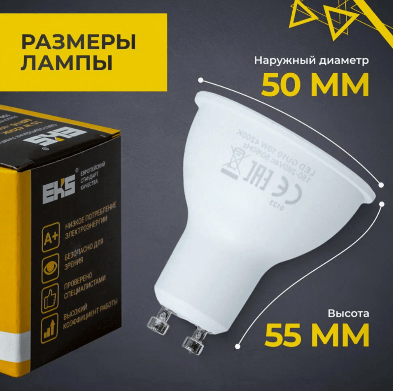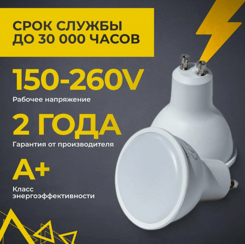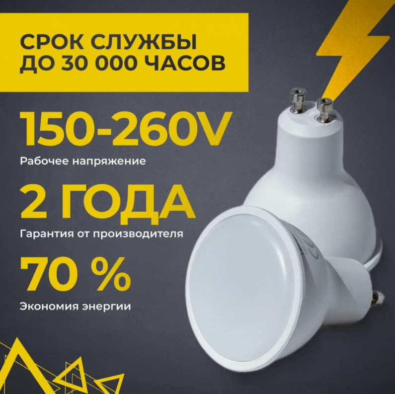 Светодиодная лампочка с цоколем GU10 обладает мощностью в 12 Вт. Цветовая температура — 5000К (нейтральный белый свет). Изделие рассчитано на использование в сети с переменным напряжением в 150-260В.