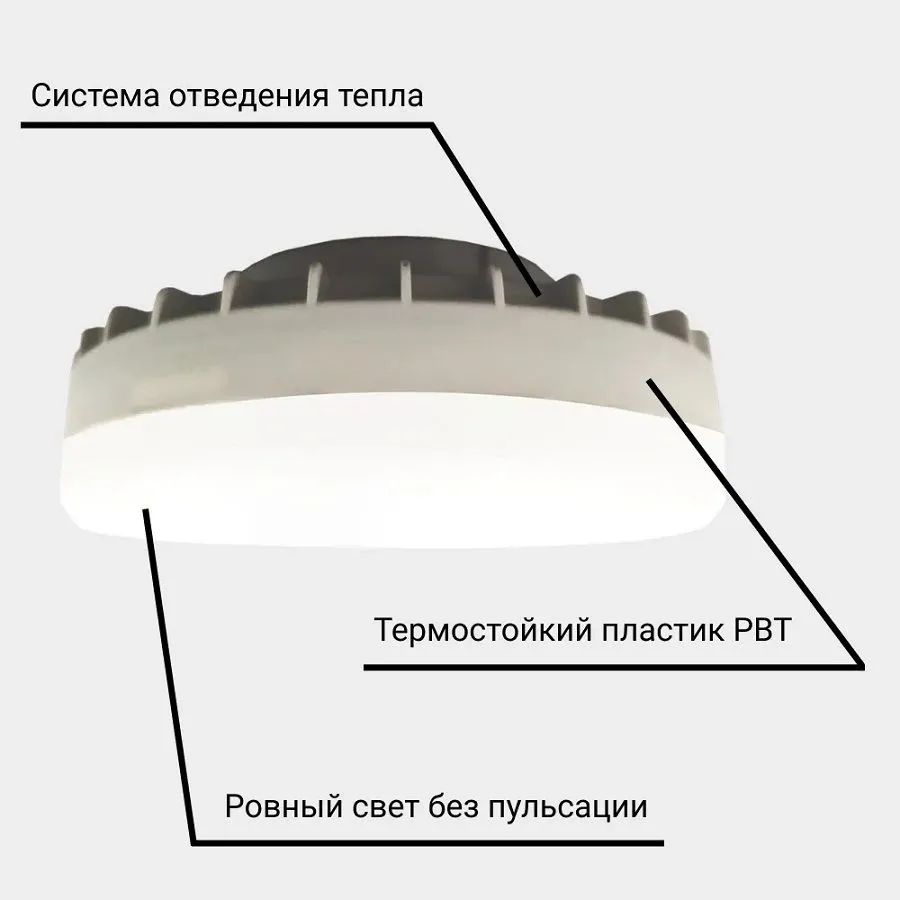 Светодиодная лампочка в форме таблетки с цоколем GX53 обладает мощностью в 8 Вт. Цветовая температура — 5000К, т.е. дневной белый свет. Изделие рассчитано на использование в сети с переменным напряжением в 175-265В.