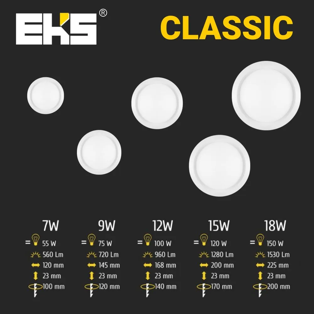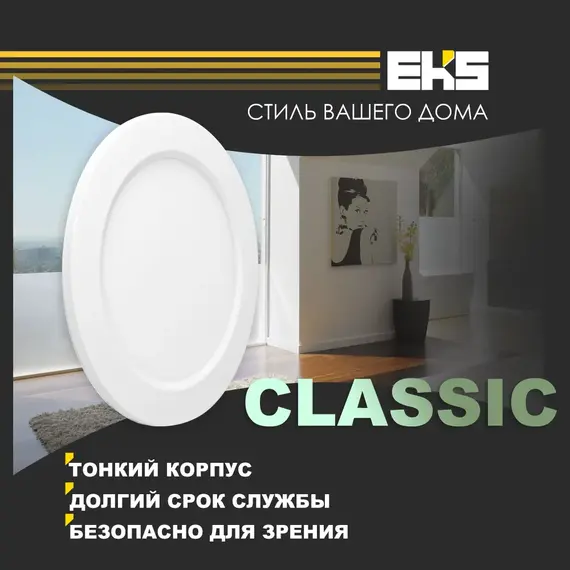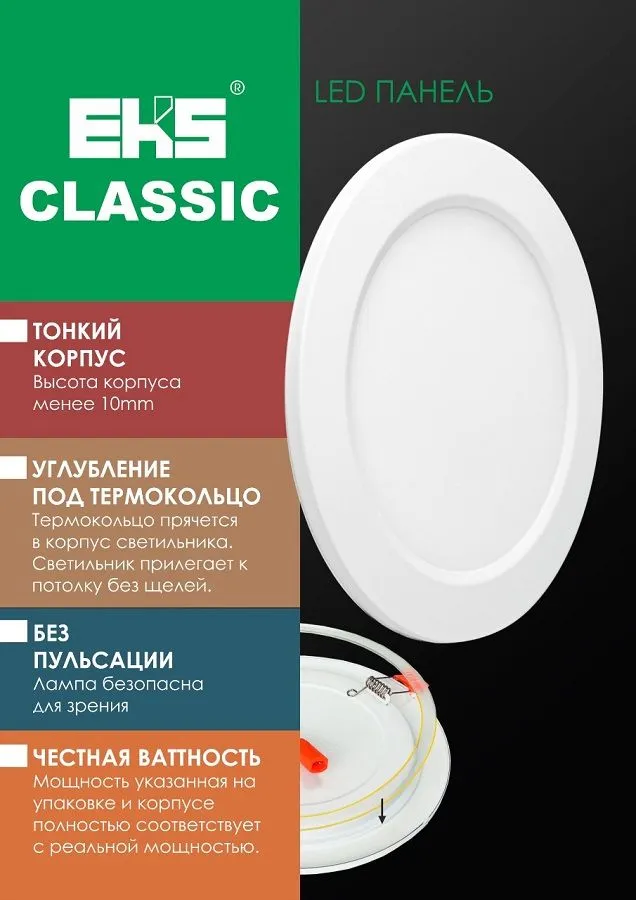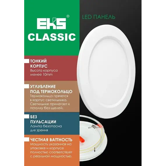 Встраиваемый светодиодный светильник EKS CLASSIC для основного, декоративного и акцентного интерьерного освещения. Универсальная LED панель подходит для натяжного потолка и любых подвесных конструкций. Светодиодная панель имеет равномерный яркий свет без пульсаций и мерцания. Не утомляет и не раздражает глаза.