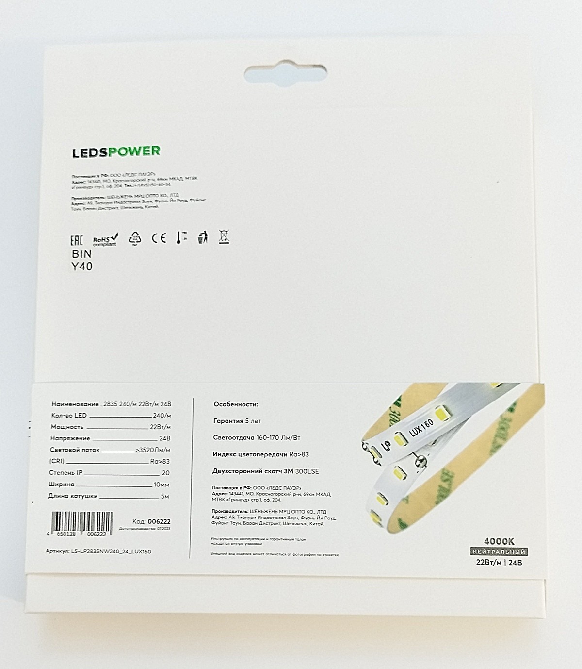 Лента светод. LEDS POWER, 22W/24V/4000K/240led, Серия LUX160 (5м.)