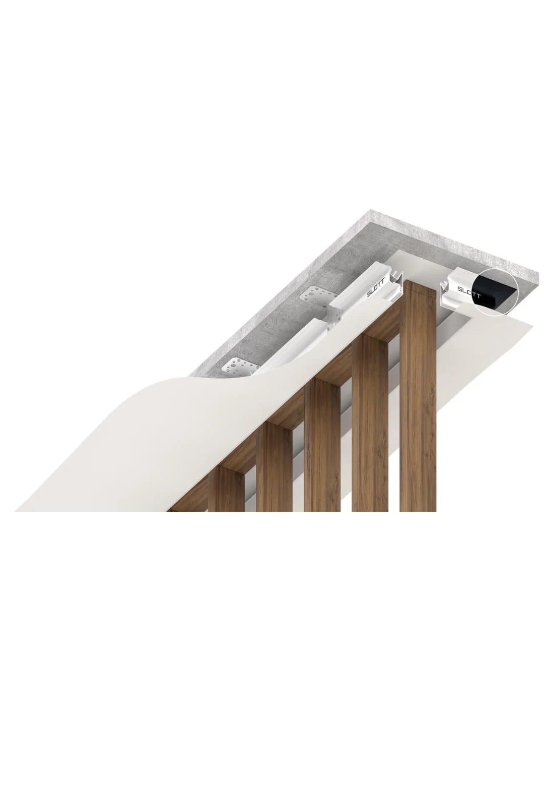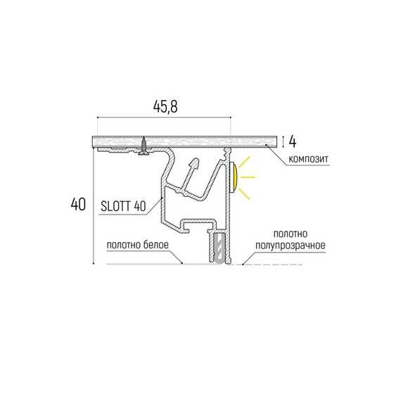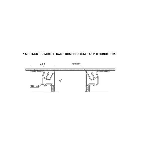 Slott 40 — это конструктивные профили для ПВХ и тканевых натяжных потолков. Относятся к классу демпферных потолков. Благодаря разработке - специальному демпферному узлу, профили надёжно и равномерно удерживают полотно. При этом достигается безщелевое, эстетичное прилегание полотна к металлу.