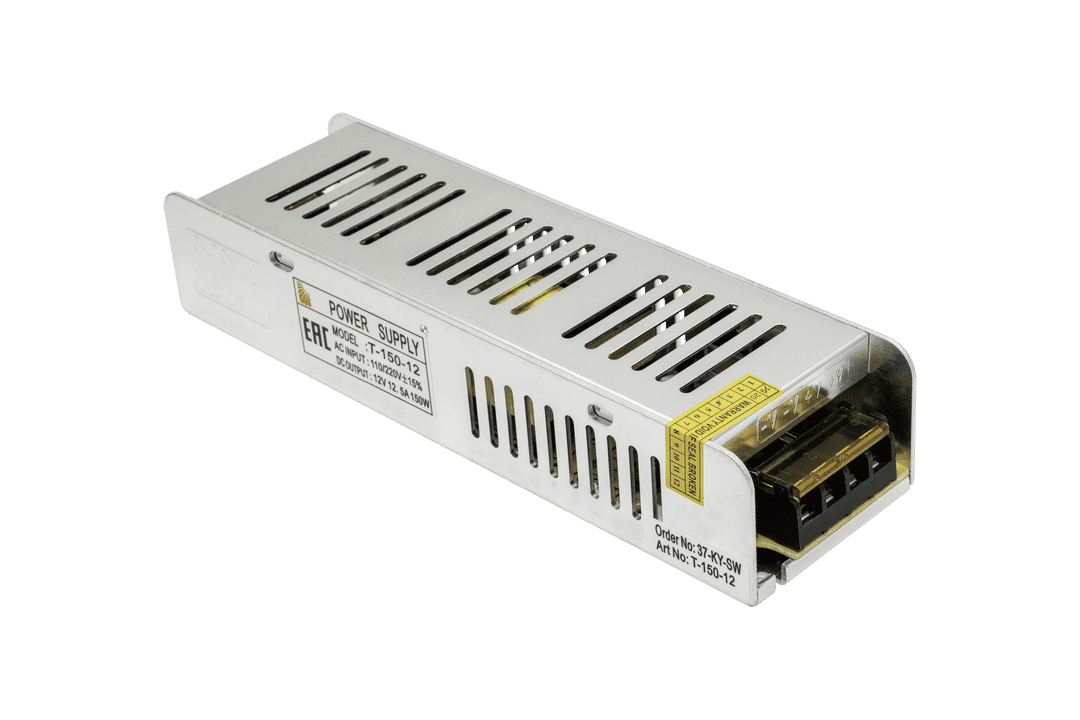 Блок питания SWG компактный (узкий), 150 W, 12V T-150-12. Габариты:200х58х38мм. Общая мощность 150Вт. Напряжение: 12V. Максимальный ток: 12.5А. Степень защиты IP: 20.