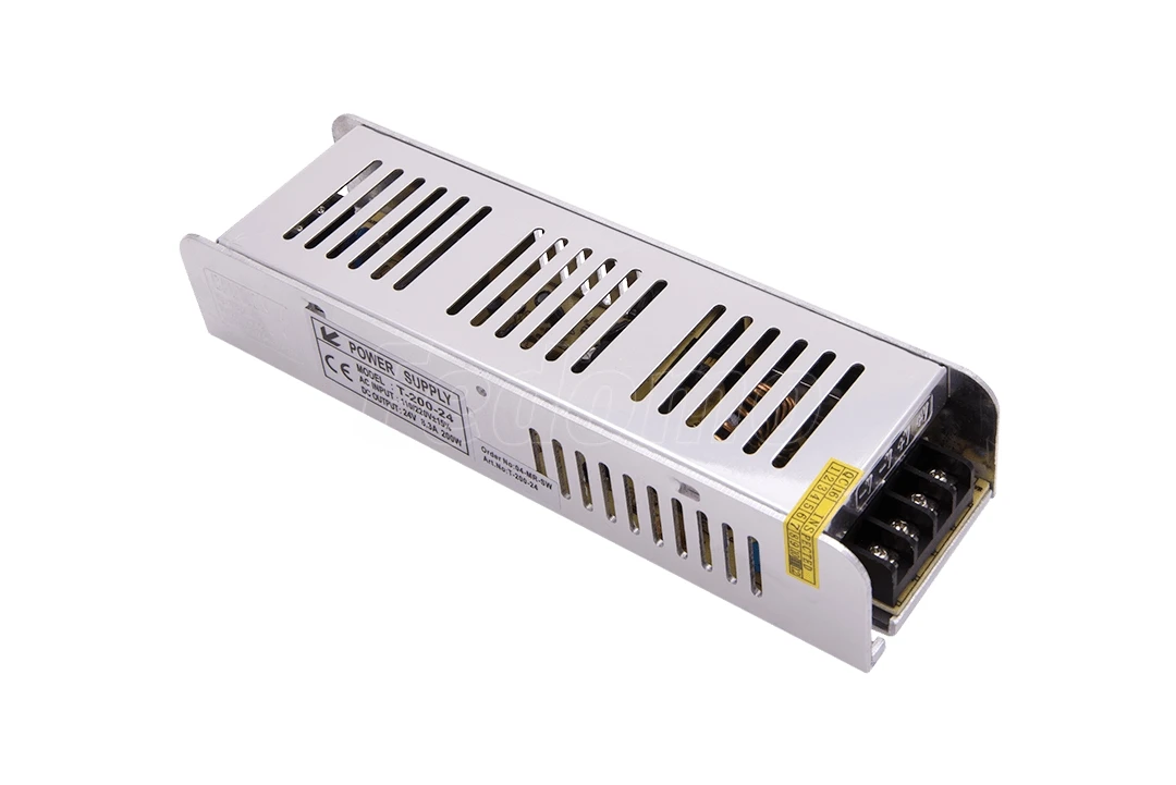 Блок питания SWG (узкий) мощностью 200 Вт и напряжением 24 В предназначен для светодиодных лент и другого оборудования, работающего от постоянного напряжения 24 В. Он имеет сверхтонкий дизайн и компактные размеры, что позволяет легко установить его в различных местах. Его артикул — T-200-24.