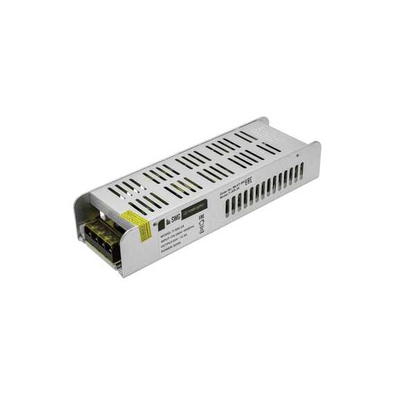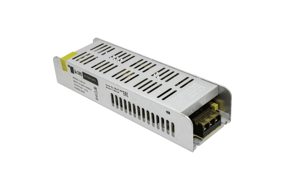 Блок питания SWG (узкий) мощностью 300 Вт и напряжением 24 В предназначен для светодиодных лент и другого оборудования, работающего от постоянного напряжения 24 В. Он имеет сверхтонкий дизайн и компактные размеры, что позволяет легко установить его в различных местах. Его артикул — T-300-24.