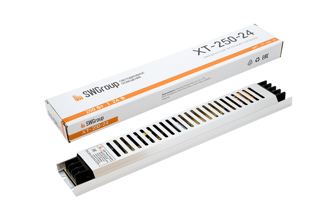 Блок питания SWG ультратонкий, 250 W, 24V ХT-250-24. Габариты:313×54×22 мм. Общая мощность 250Вт. Напряжение: 24V. Максимальный ток: 10.41А. Степень защиты IP: 20.