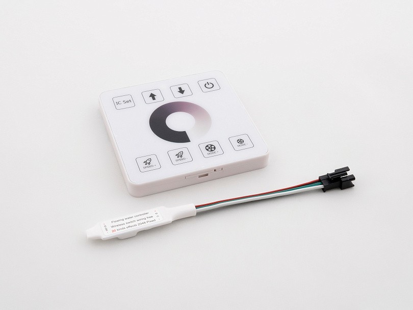 Контроллер FLOWING WATER сенсорный 1024 IC 12–24 В — это устройство для управления светодиодной лентой с эффектом «Бегущая волна». Он оснащён пультом дистанционного управления и работает с напряжением 12–24 В. Максимальное количество управляемых точек — 1024, расстояние работы — 15 метров, а количество режимов — 20.