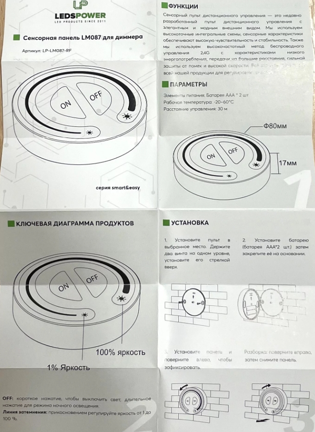 Сенсорная панель LM087 для диммера серия Smart&Easy - пульт дистанционного управления с элегантным и модным внешним видом , предназначен для управления светодиодной продукцией, работающей от постоянного напряжения DC 5-24В. С помощью пульта дистанционного управления можно регулировать яркость свечения, а также включать и выключать привязанный контроллер . Работает с радиочастотным пультом дистанционного управления RF 2.4 ГГц на расстоянии до 30 метров .