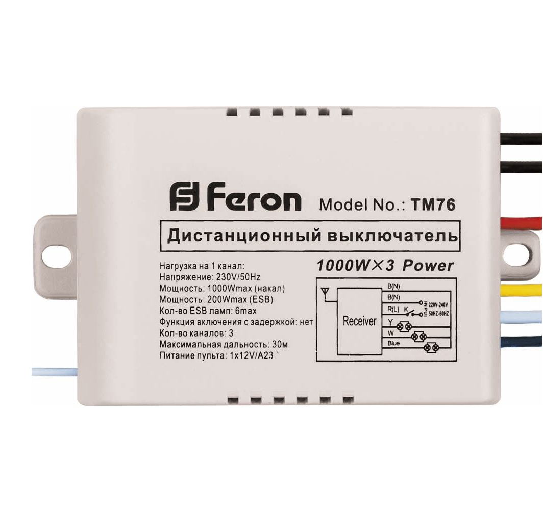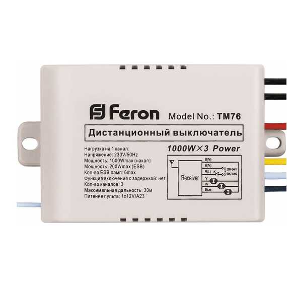 Дистанционный выключатель ТМ76 имеет 3 канала, на каждый из которых можно подключить только часть осветительных приборов в помещении и включать эти части, с помощью пульта раздельно. Либо возможно подключить все каналы для всего освещения. Большой запас мощности на каждом канале, позволяет подключать мощные и многоламповые осветительные приборы.
