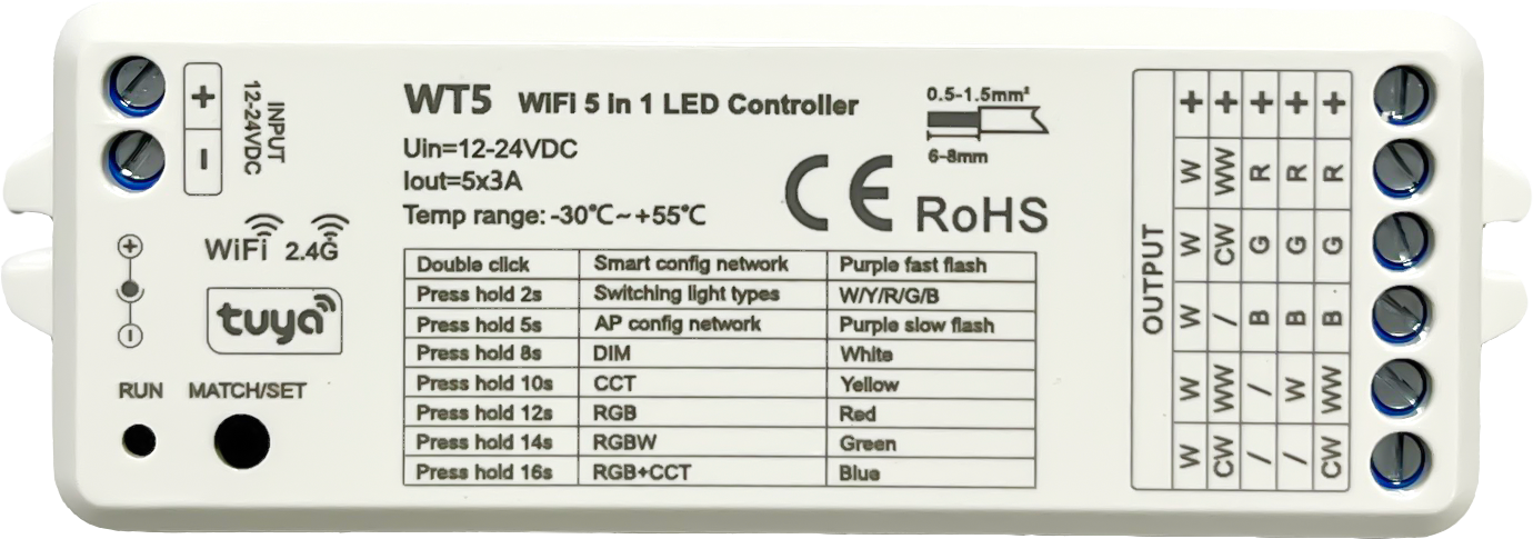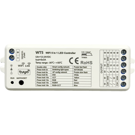 Контроллер WIFI Smart 5 в 1 WT5 DIM(15A)RGB(9A)RGBW(12A)CCT(12A) 5*3A = 15A, 12-24v