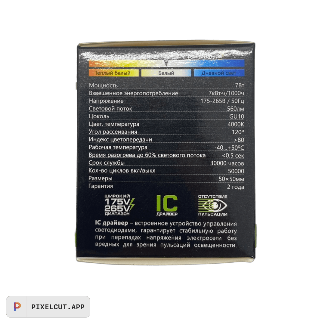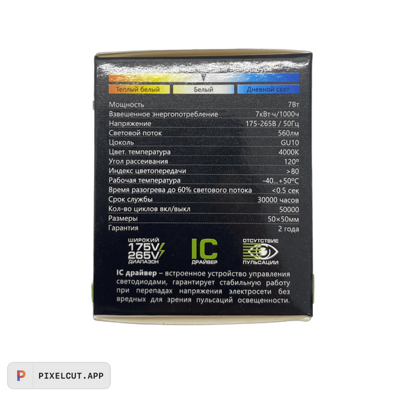 Новая модель рефлектора Экола GU10 с потребляемой мощностью 7 ватт заменяет галогенку мощностью в 60-65 ватт. Главными отличиями стало то, что лампа стала существенно меньше весить, что важно для натяжных потолков, а также за счет отсутствия алюминиевого радиатора стала ниже цена.