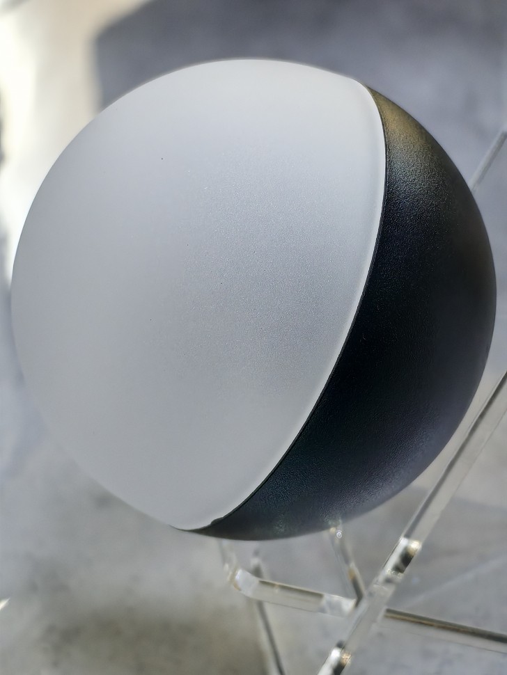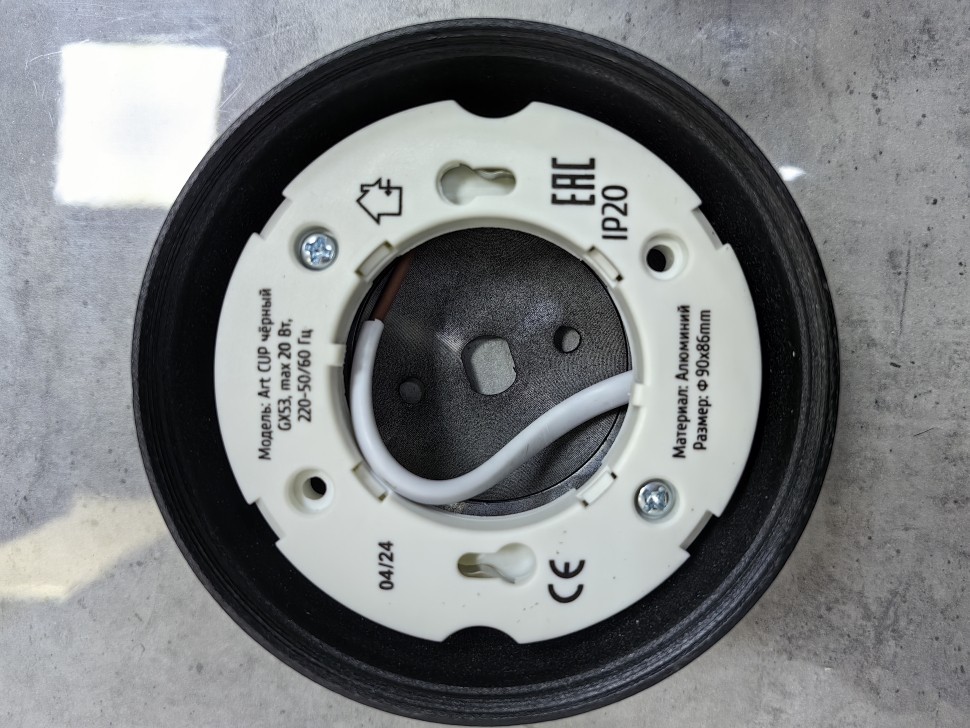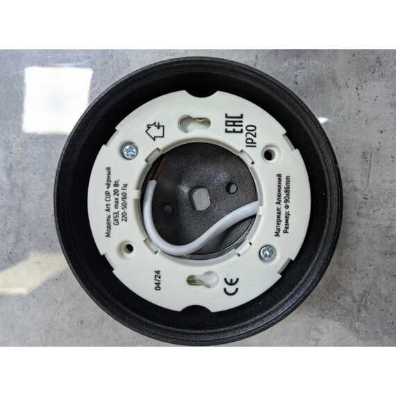 Универсальный светильник EKS ART CUP представлен в классическом черном цвете. Имеет металлический (алюминиевый) корпус и пластиковый матовый рассеиватель, а также качественный термостойкий цоколь, который предназначен для ламп GX53 (мощностью максимум до 20 Вт). Также у светильника уже предусмотрено углубление под термокольцо.
