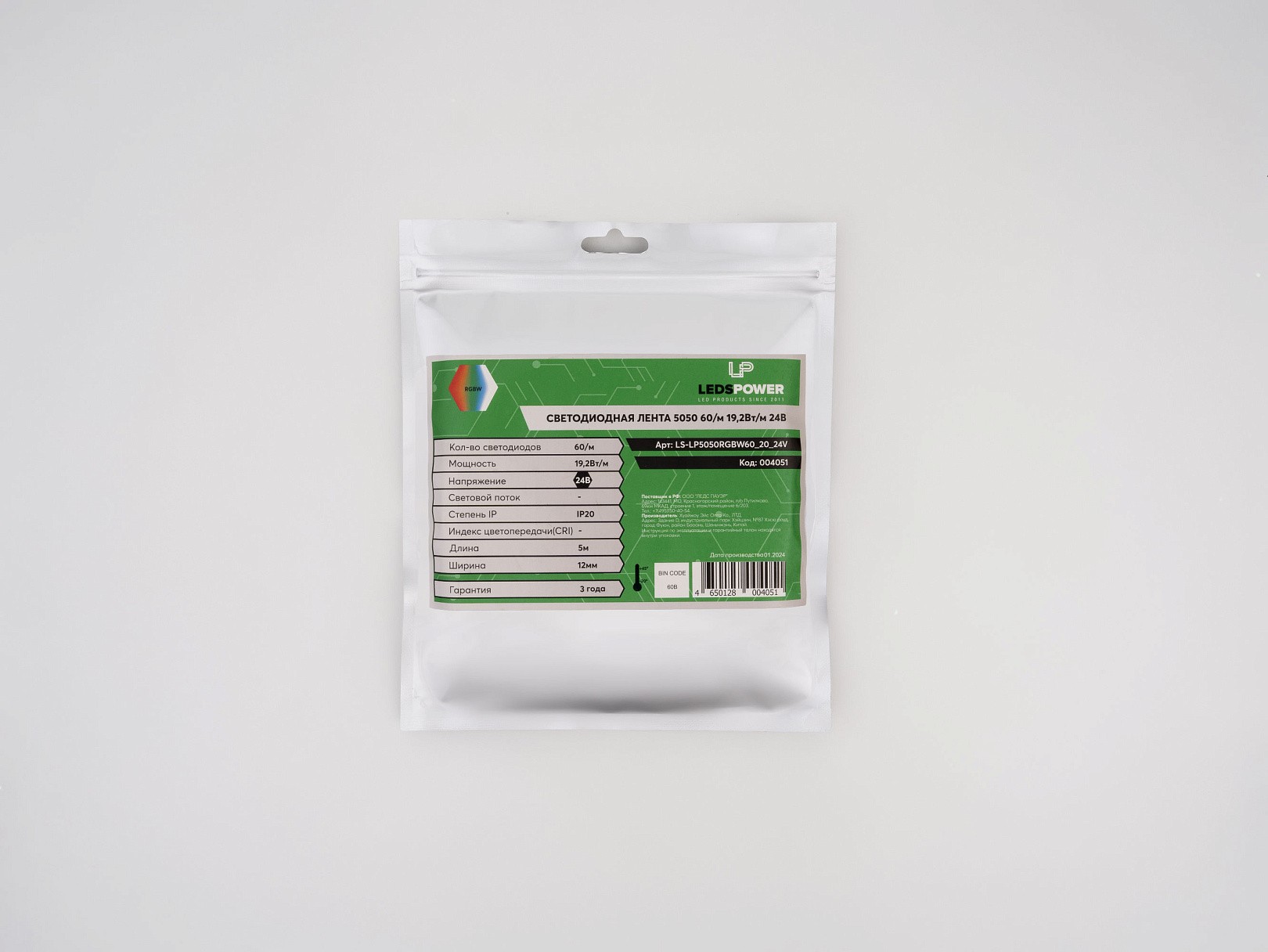 Светодиодная лента LP 5050 60/м (19,2 Вт/м) работает от напряжения 24 В и имеет цветовую температуру RGBW (красный, зелёный, синий, белый). Лента однорядная, с плотностью 60 светодиодов на метр и индексом цветопередачи RA >80. Она предназначена для использования в декоративных и функциональных целях, например, для подсветки потолков, мебели, витрин и т. д.