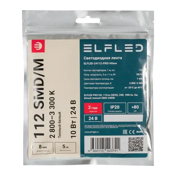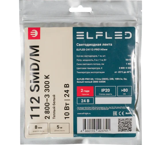 Лента светодиодная ELFLED PRO140, 10Вт/м, 24В, тепл., 2800-3300К, 112д/м, 5м