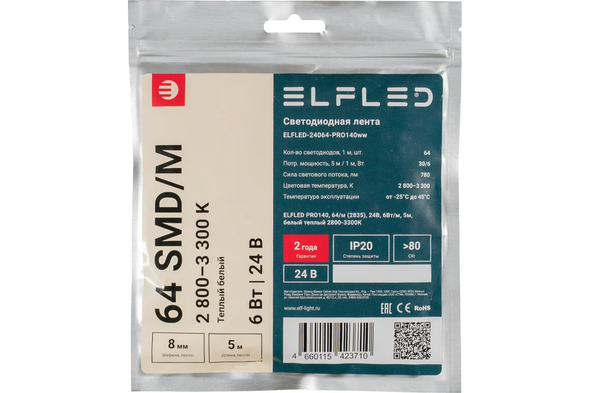 Лента светодиодная ELFLED PRO140, 6Вт/м, 24В, тепл., 2800-3300К, 64д/м, 5м