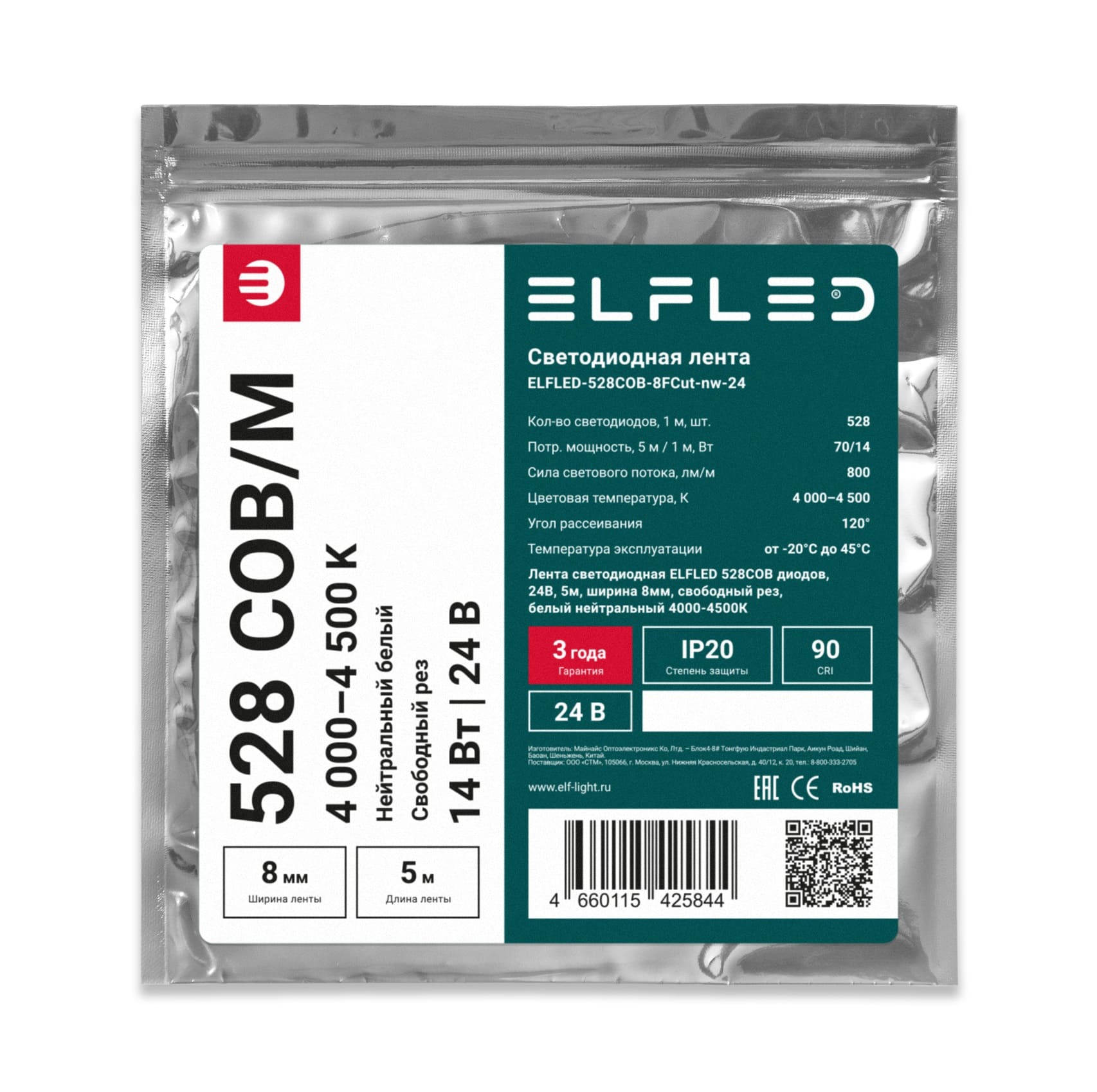 Светодиодная лента ELFLED 14w 528COB/м диодов 4000-4500K 8мм свободный рез 24V