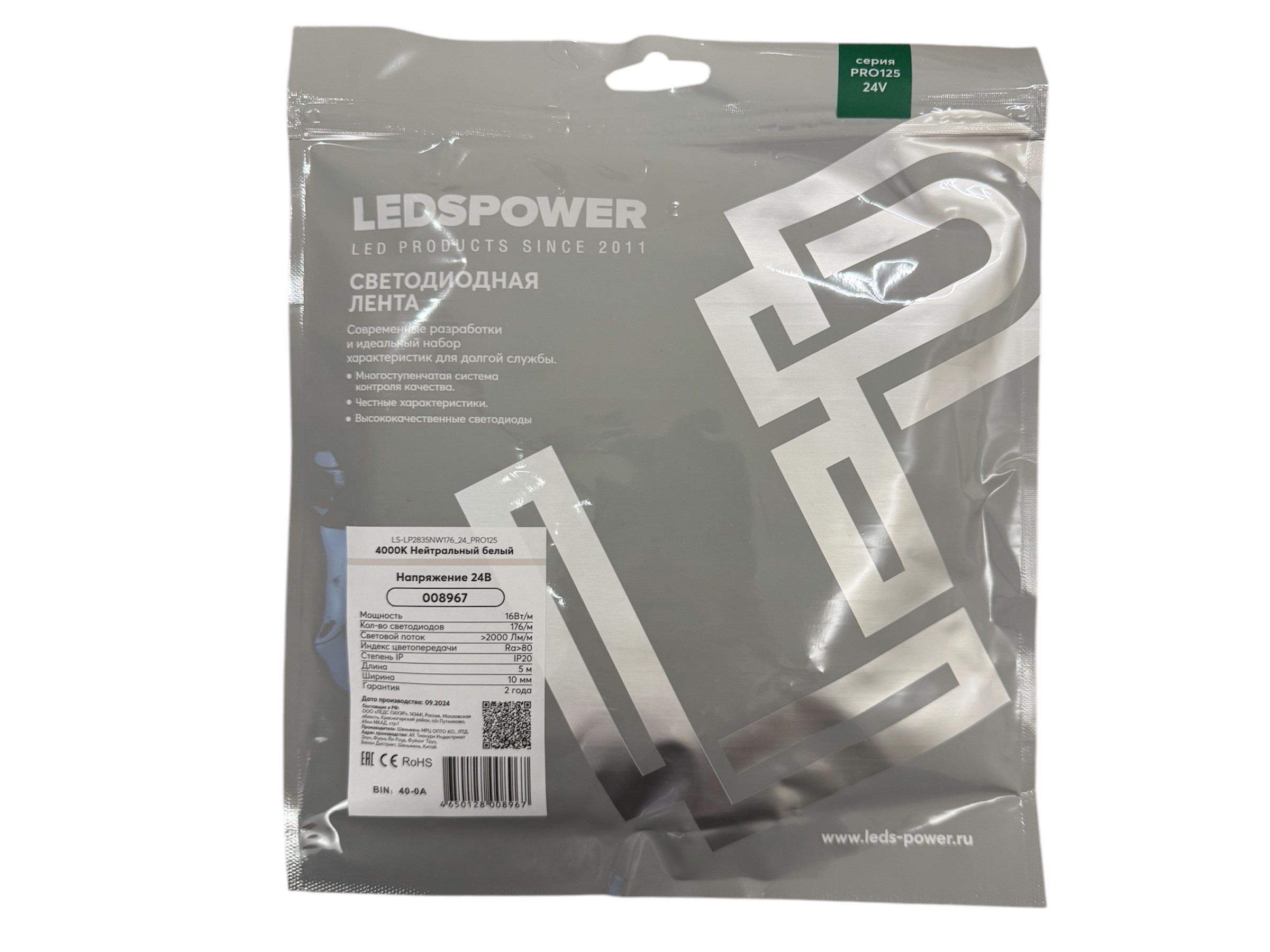 008967 Светодиодная лента LEDS POWER 2835 16Вт/м, 24В, 176д/м, нейтральная серия ПРО125