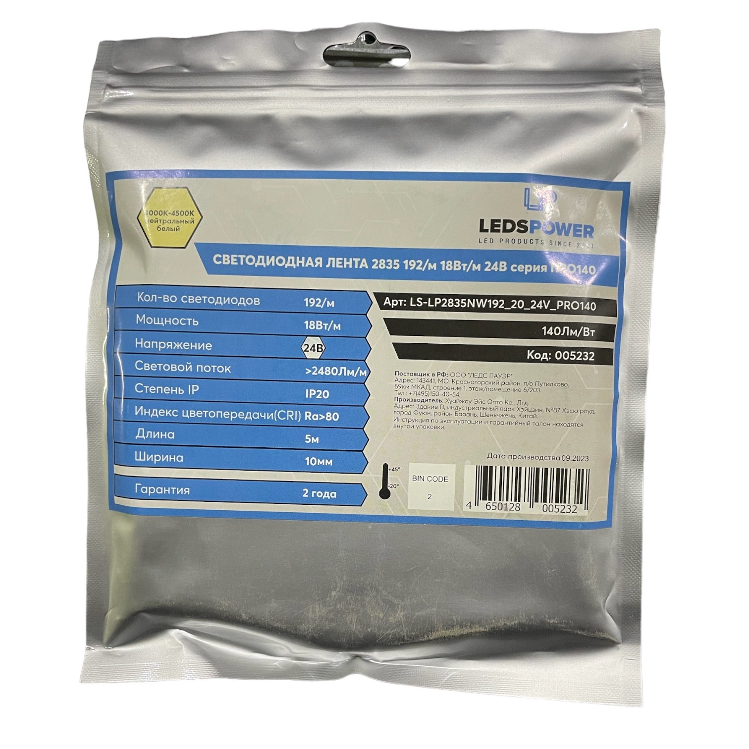Светодиодная лента LEDS POWER (серия ПРО140), 5м, 24В, IP20, 192 LED/m, нейтральный белый.