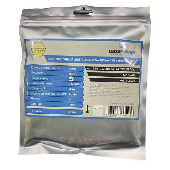 Светодиодная лента LEDS POWER 2835 18Вт/м, 24В, 192д/м, нейтральная серия ПРО140