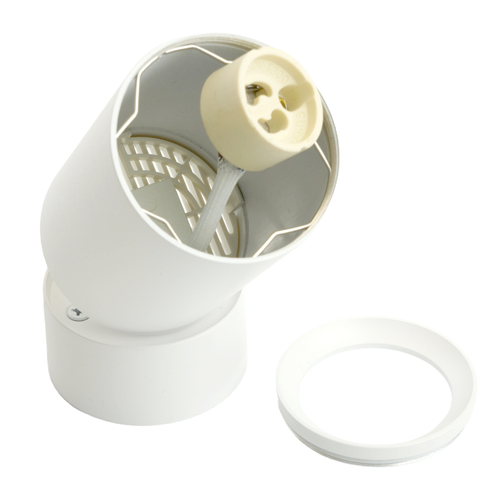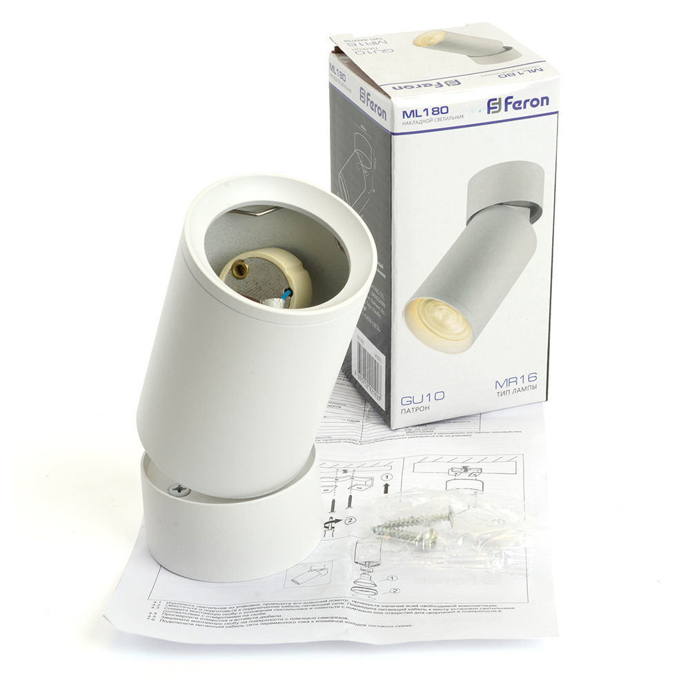 Цилиндрический накладной светильник ML180 Feron имеет надежный алюминиевый корпус, патрон GU10 для ламп MR16 и возможность направлять свет при изменении угла наклона светильника.