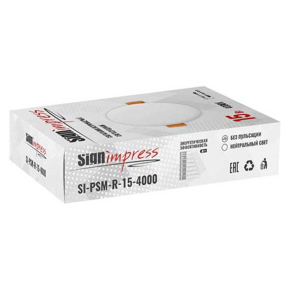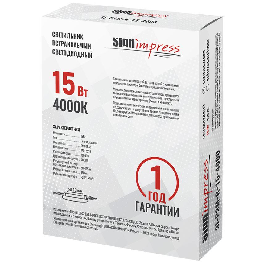 Светильник светодиодный регулируемый (до 105мм) 15Вт 4000K 1200Лм SI-PSM-R-15-4000 SignImpress. Механизм регулировки монтажного диаметра позволяет решить проблему несовпадения диаметра установочного отверстия при замене одних светильников на другие. Светильник встраиваемый не содержат ртутьсодержащих веществ, поэтому он не представляет опасности в случае выхода из строя или разрушения.