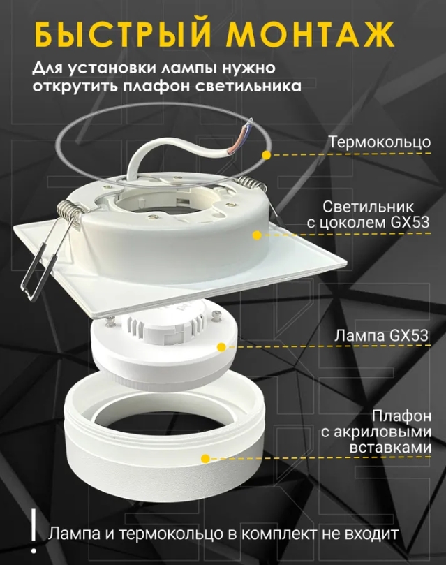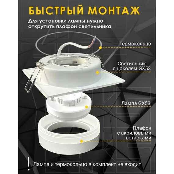 5. Световая температура: Модель TERRA может быть оснащена различными типами ламп GX53 ( в комплект не входит), что позволяет выбирать подходящую цветовую температуру в зависимости от ваших предпочтений и потребностей. Это дает возможность создать нужную атмосферу — от теплого и уютного до холодного и энергичного. У встраиваемого светильника термостойкий цоколь.