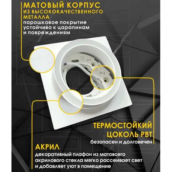 1. Универсальный стиль: Квадратная форма и лаконичный черный цвет делают этот светильник подходящим для интерьеров в стиле лофт, минимализм, хай-тек, современном. Он гармонично вписывается как в жилые, так и в коммерческие пространства. Дополнительный декоративный рассеиватель с акриловой вставкой полностью скрывает зазор между самим светильником и лампой. У светильника для натяжного потолка есть выемка под термолькольцо, которая позволяет избежать внутренней вклейки и установить светильник на полотно.