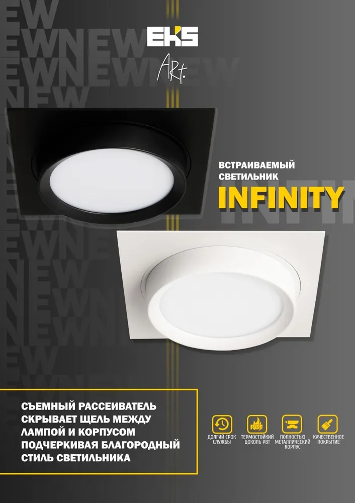 Встраиваемый светильник GX53, ART INFINITY отлично подойдет для установки на низкий потолок в гостиной, оформленной в стиле хай-тек. Производитель EKS рекомендует использовать для устройства светодиодные лампы с цоколем GX53 (в комплект поставки не входят). Светильник произведен с использованием материалов: металл и акрил и может использоваться для натяжного потолка.