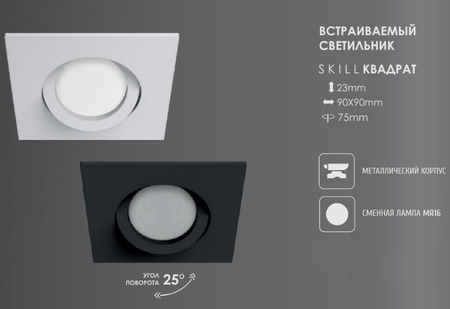 Встраиваемый светильник MR16, SKILL идеально впишется в любой современный интерьер. Благодаря своему металлическому корпусу и качественному покрытию — светильник выглядит эстетично и порадует глаз любому дизайнеру интерьеров.