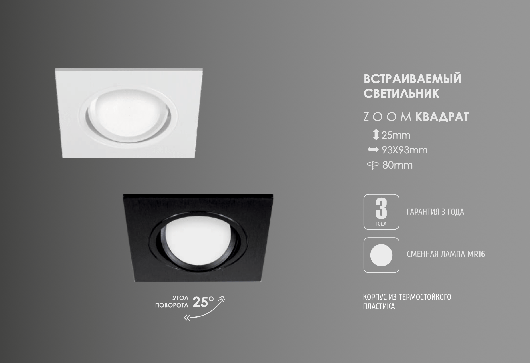 Встраиваемый светильник MR16, ZOOM квадрат идеально впишется в любой современный интерьер. Благодаря своему корпусу из термостойкого пластика и качественному покрытию — светильник выглядит эстетично и порадует глаз любому дизайнеру интерьеров.