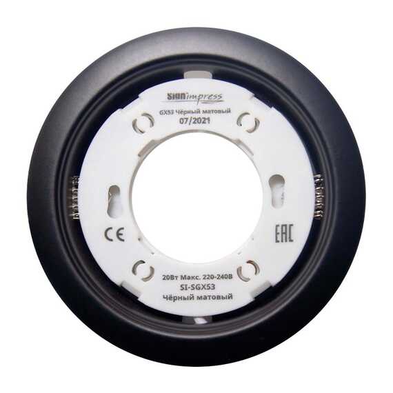 Светильник встраиваемый GX53 Белый SignImpress с плоским патроном (который производится из материалов диэлектриков) оснащенным двумя прорезями и контактами для штырьков лампы, которые вводят в патрон и проворачивают до упора. Металлический корпус с защитно-декоративным покрытием из качественных материалов. Провод по ГОСТ, без занижения сечения. Продуманная конструкция патрона, позволяет использовать лампы с отклонениями от размеров и обеспечивает замену лампы без проблем и надежный эл. контакт. Пружинные лапы оптимальны и удобны в монтаже и демонтаже, исключено повреждение потолка. Cветильник предназначен для освещения административных, офисных и жилых помещений. Рассчитан для работы с лампами цоколя GX53. Так же устанавливается совместно с протекторным кольцом.