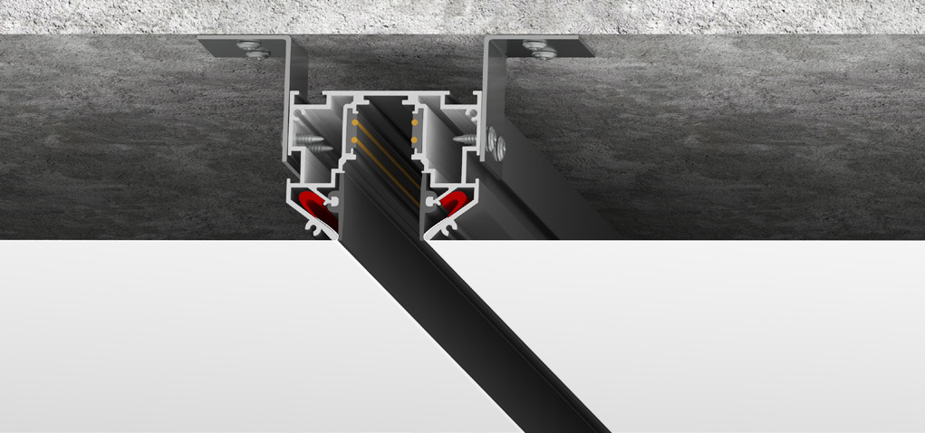 Конструкция профиля предусматривает фиксацию полотна при помощи гарпунной системы крепления. Таким образом Track 23 монтируется и располагается на одном уровне с натяжным потолком.