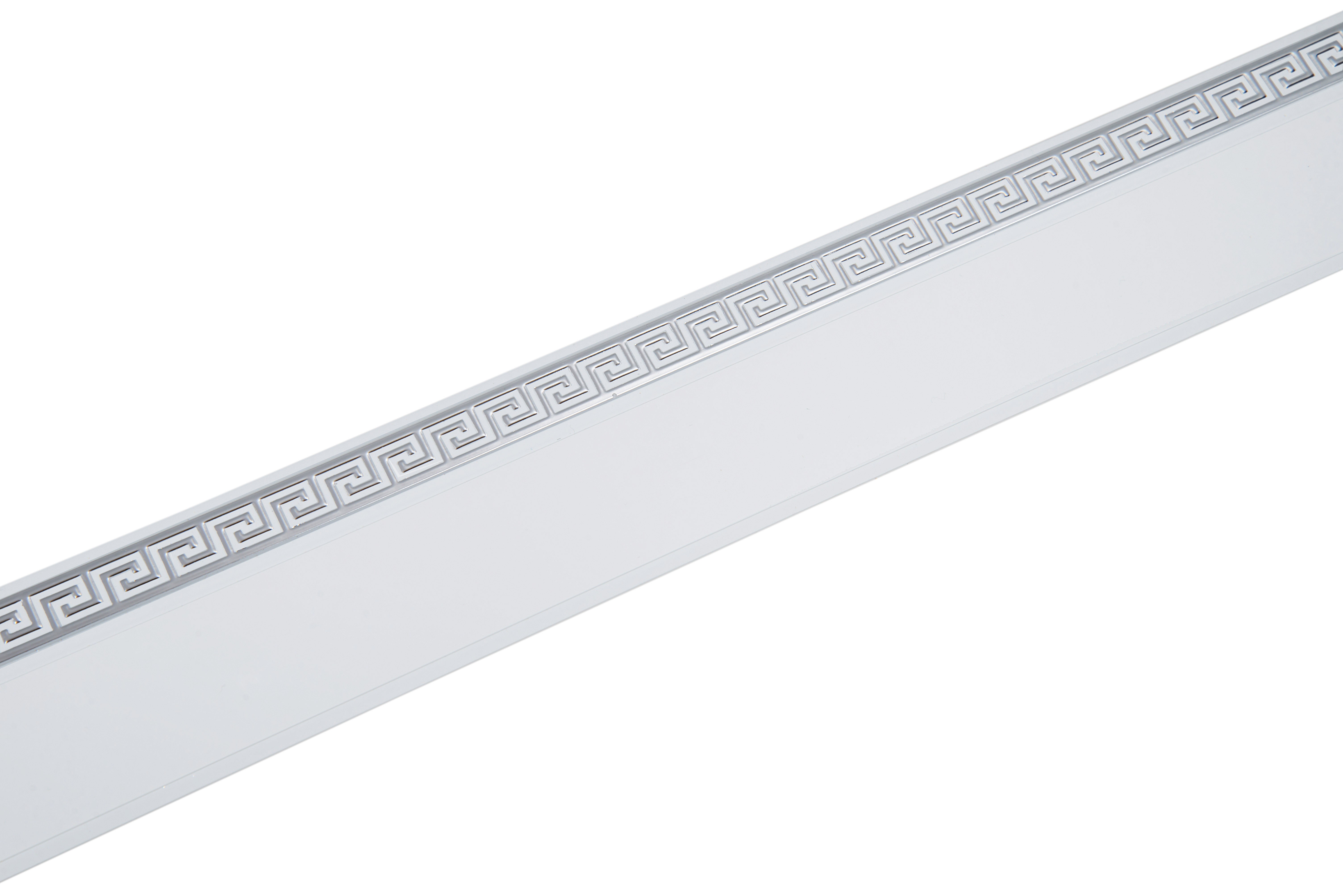 Фасадная планка Magellan Классик бленда ПВХ 5 см, 4 м белого цвета с серебряным, "греческим" меандром представляет собой декоративную накладку на карниз.